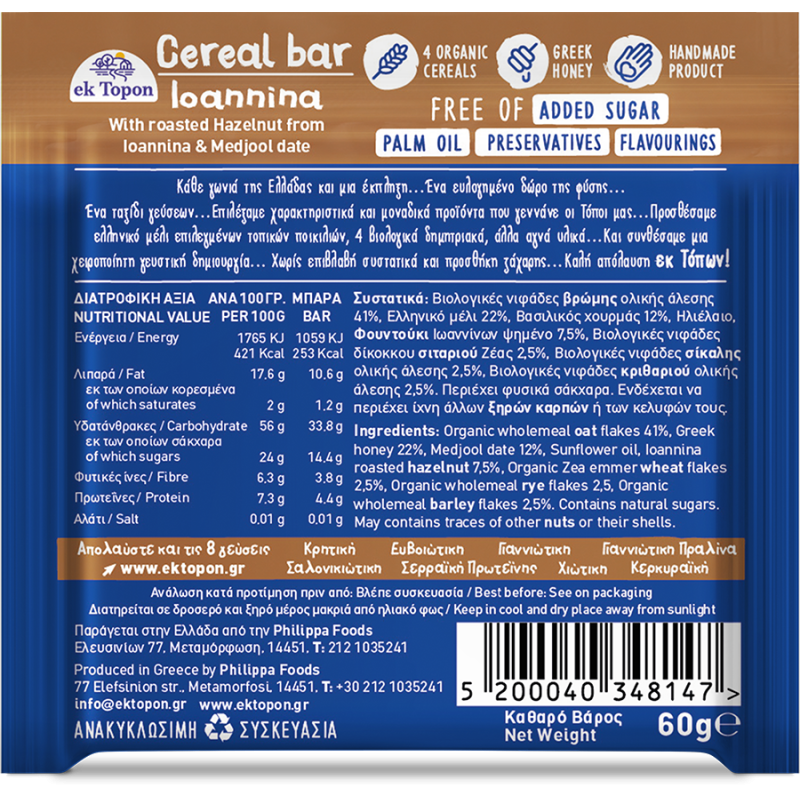 Βιολογικές νιφάδες βρώμης ολικής άλεσης 41%, Ελληνικό μέλι 22%, Βασιλικός χουρμάς 12%, Ηλιέλαιο, Φουντούκι Ιωαννίνων ψημένο 7,5%, Βιολογικές νιφάδες δίκοκκου σιταριού Ζέας 2,5%, Βιολογικές νιφάδες σίκαλης ολικής άλεσης 2,5%, Βιολογικές νιφάδες κριθαριού ολικής άλεσης 2,5%. Περιέχει φυσικά σάκχαρα. Ενδέχεται να περιέχει ίχνη άλλων ξηρών καρπών ή των κελυφών τους.