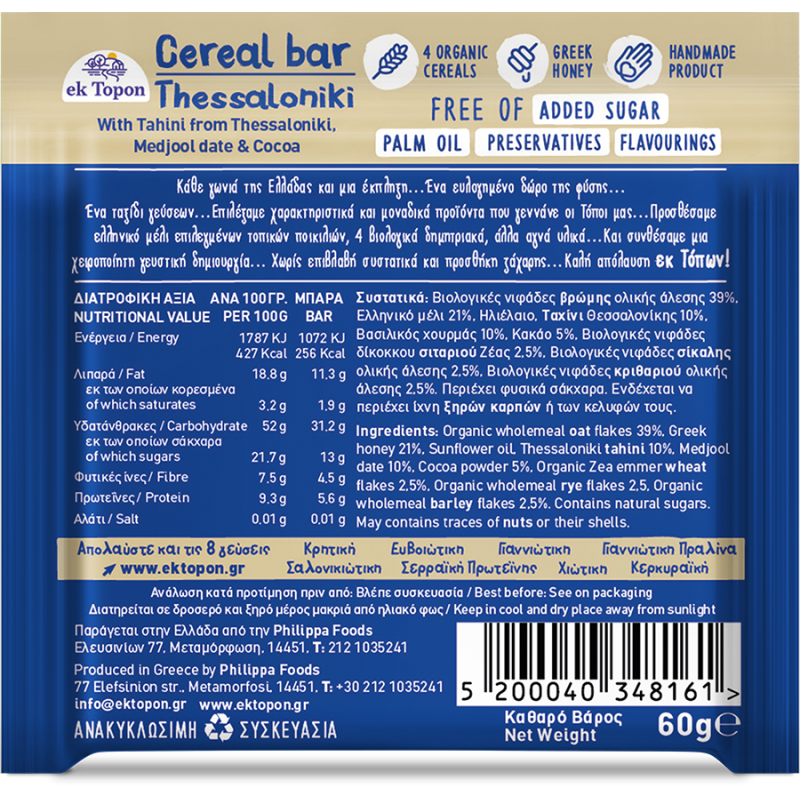 Βιολογικές νιφάδες βρώμης ολικής άλεσης 39%, Ελληνικό μέλι 21%, Ηλιέλαιο, Ταχίνι Θεσσαλονίκης 10% (100% αλεσμένο σουσάμι), Βασιλικός χουρμάς 10%, Κακάο 5%, Βιολογικές νιφάδες δίκοκκου σιταριού Ζέας 2,5%, Βιολογικές νιφάδες σίκαλης ολικής άλεσης 2,5%, Βιολογικές νιφάδες κριθαριού ολικής άλεσης 2,5%. Περιέχει φυσικά σάκχαρα. Ενδέχεται να περιέχει ίχνη ξηρών καρπών ή των κελυφών τους.