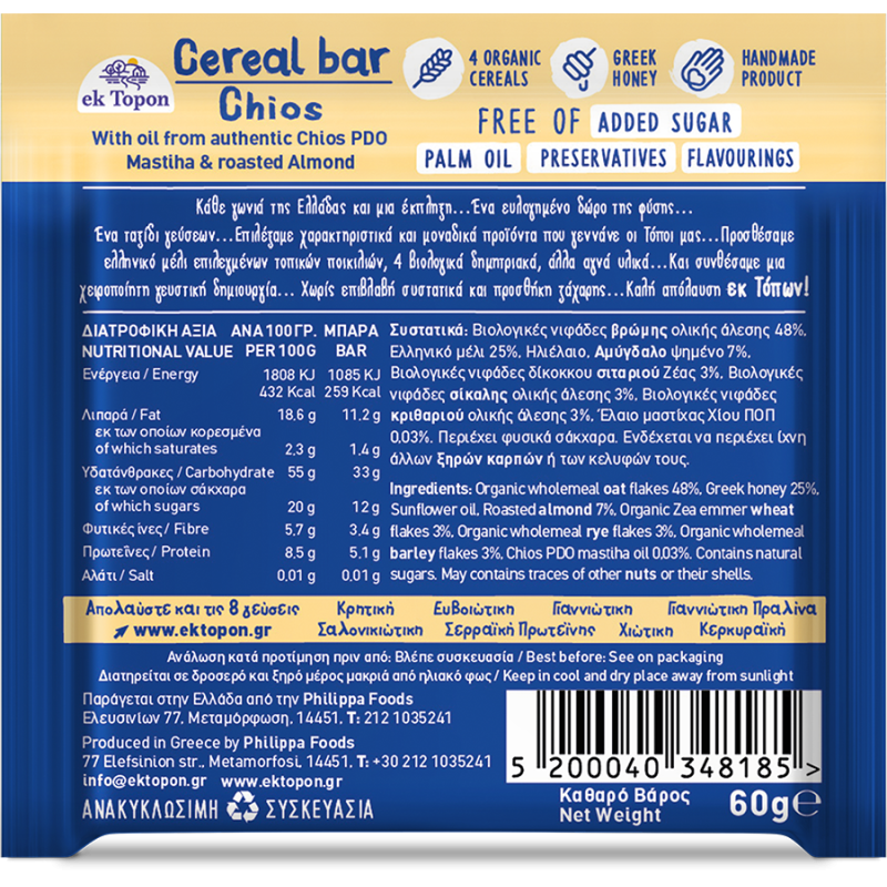Βιολογικές νιφάδες βρώμης ολικής άλεσης 48%, Ελληνικό μέλι 25%, Ηλιέλαιο, Αμύγδαλο ψημένο 7%, Βιολογικές νιφάδες δίκοκκου σιταριού Ζέας 3%, Βιολογικές νιφάδες σίκαλης ολικής άλεσης 3%, Βιολογικές νιφάδες κριθαριού ολικής άλεσης 3%, Έλαιο μαστίχας Χίου ΠΟΠ 0,03%. Περιέχει φυσικά σάκχαρα. Ενδέχεται να περιέχει ίχνη άλλων ξηρών καρπών ή των κελυφών τους.